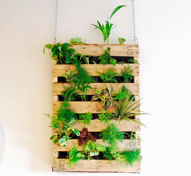 Crie uma horta ou um jardim vertical jardim vertical na sua varanda. Forre o interior da palete com tela e encha com terra vegetal. Plante as suas ervas de cheiro ou flores preferidas nas aberturas e topos, certificando-se de que a terra está bem compactada antes de colocar a palete na posição vertical apoiada numa parede. [image via drawingsunderthatable]
