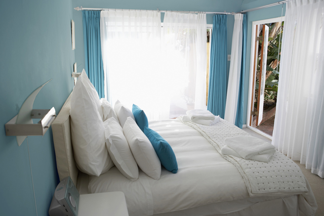 Por oposição, o azul é considerado calmante, relaxante e sereno, indicado para reduzir os níveis de pressão arterial, frequência respiratória e batimento cardíaco, sendo por este motivo bastante adequado para quartos ou outros espaços para descansar. Curiosamente, alguns estudos indicam ainda que o azul tem um efeito inibidor do apetite, pelo que poderá ser desaconselhável a sua utilização abundante em restaurantes. No entanto, alguns tons de azul podem tornar-se demasiado frios e desconfortáveis, especialmente quando aplicado em divisões orientadas a norte ou com pouca luz natural. Neste caso, aconselha-se a utilização de tons de azul mais vibrantes, combinados com mobiliário e acessórios em tons quentes para equilibrar o ambiente.