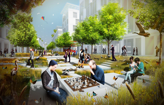 Este parque linear aquático filtra as águas da chuva através da própria vegetação que o constituí, para dar as condições ideais para abrigar a fauna e flora indígenas na metrópole atarefada.