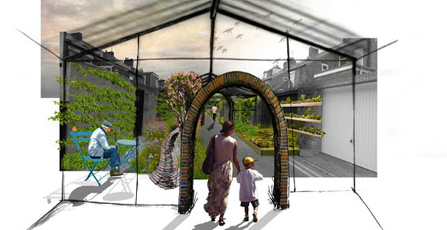 Nesta proposta, as casas com terraços seriam modificadas para incluir passadiços verdes que cozem os diferentes edifícios da cidade numa rede de experiências comunitárias.