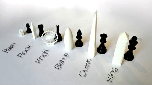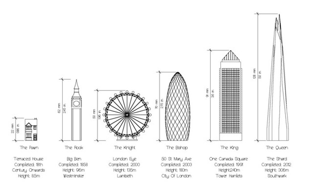 Ao criar cada peça, foi considerando o seu valor arquitectónico e simbólico para a cidade, bem como o seu valor no tabuleiro de xadrez. Deste modo o peão consiste na tradicional casa geminada; o bispo deve a sua forma ao edifício conhecido por “gherkin” (pepino) do arquitecto Norman Foster; o cavalo assume a forma da roda do London Eye; a torre corresponde ao emblemático Big Ben; o papel da rainha é desempenhado pelo edifício mais dominante no horizonte de Londres, o Shard of Glass de Renzo Piano; e o papel do rei cabe ao imponente Canary Wharf.
