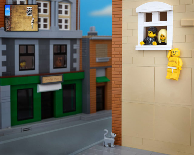 LEGO Banksy - Hanging Around (a partir do original de Banksy Naked Man Hanging From Window) © Jeff Friesen / The Brick Fantastic