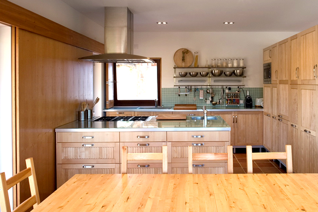 A escolha dos materiais foi cuidada – a cor verde-claro dos armários e o revestimento do pavimento em madeira – materiais e cores relacionados com o elemento Árvore que harmoniza o fogo e a água da cozinha. O fogão numa ilha permite visualizar todo o espaço enquanto cozinha e observar as janelas e portas.