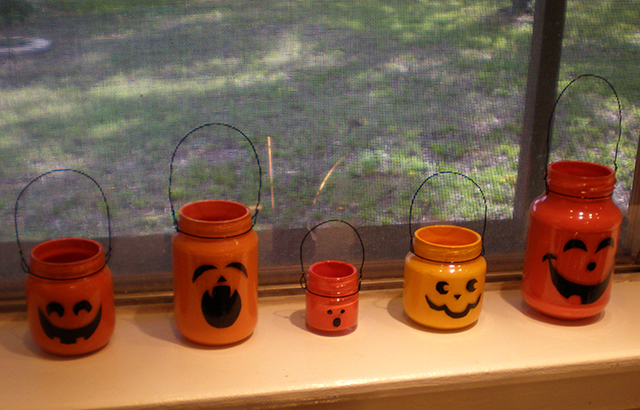 Para as crianças, o verdadeiro centro das atenções serão sempre os doces. Pode criar cestos de guloseimas muito originais reciclando frascos de vidro usados com decorações de Halloween. Basta pintá-los por dentro com cores de abóbora e por fora desenhar algumas caretas assustadoras, usando tinta preta ou marcadores permanentes. Para fazer uma asa enrole um arame em volta da boca do frasco e amarre com a ajuda de um alicate. Com outro arame faça um arco e enganche no arame em volta do fasco, apertando com um alicate.