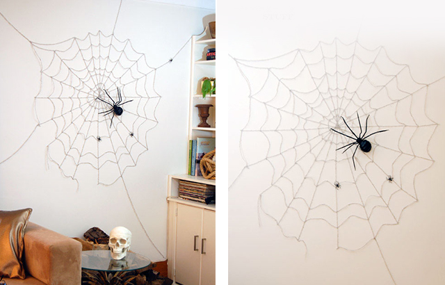 Pode fazer uma teia de aranha gigante na sua parede utilizando apenas fio de lã e fita adesiva. Comece por colar pequenos pedaços de fita adesiva dupla nos pontos onde quer agarrar o fio de lã, de forma a criar linhas rectas cruzadas no centro, como um asterisco. Depois passe um fio de lã em círculos concêntricos ligeiramente folgados, fixando-o nos pontos com fita adesiva. Basta juntar pequenas aranhas de borracha, ou mesmo em papel, para criar o efeito de teia na parede.