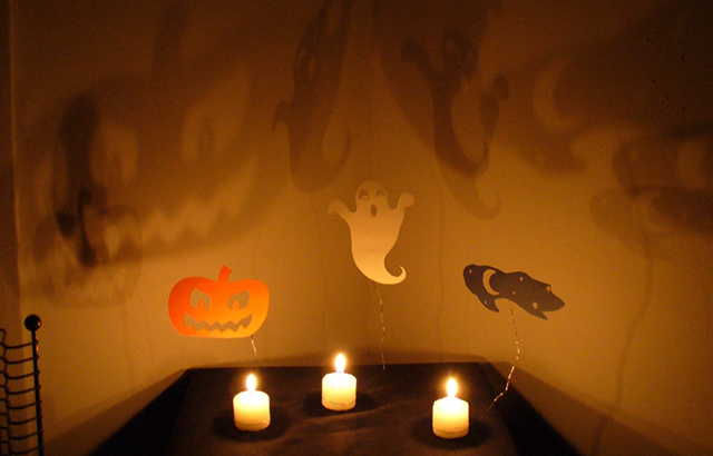 Com a ajuda de um arame poderá pendurar silhuetas assustadoras sobre velas acesas para criar um efeito espectacular de sombras que parecem dançar nas paredes. Pode descarregar algumas silhuetas de bruxas, gatos ou outros monstros aqui.