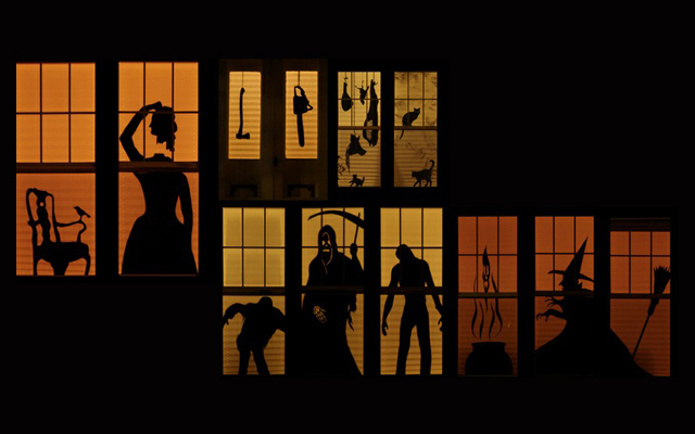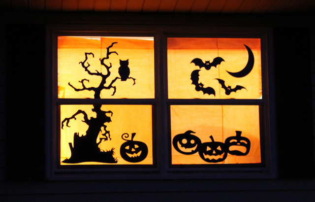 Experimente simplesmente cortar algumas silhuetas assustadoras em cartolina preta e colocá-las nas janelas. Pode criar fantasmas, bruxas, monstros, gatos ou dar asas à sua imaginação. Fixe as silhuetas apenas com um pouco de fita adesiva para que possa retirá-las e reutilizá-las para o próximo ano.
