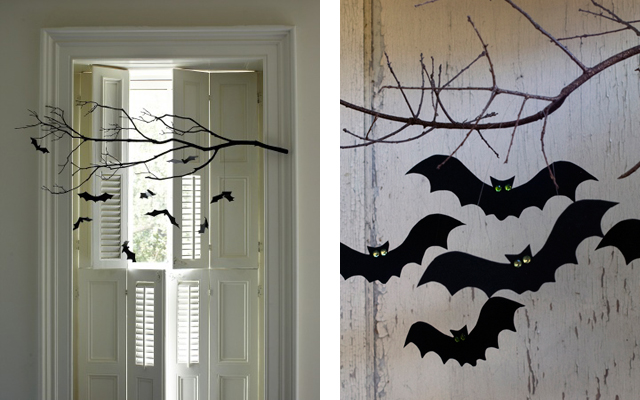 Com um ramo ou galho seco e uns recortes em cartolina preta pode criar um mobil de morcegos perfeito para colocar junto de uma porta ou janela. Basta fazer um pequeno furo em cada morcego para poder passar um fio e amarrá-los ao galho de árvore que, se preferir, poderá pintar de branco, preto ou de diversas cores.