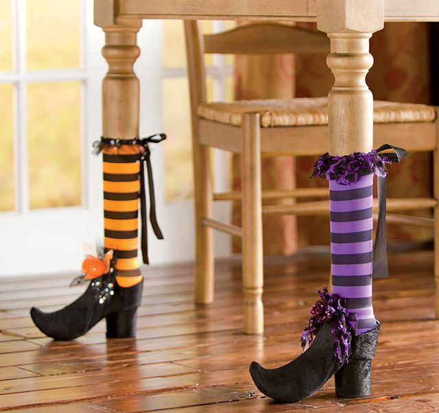 Adicione um pouco de humor transformando as pernas das suas mesas e cadeiras em pernas e pés bruxa. Basta vestir as pernas das suas mesas e cadeiras com meias coloridas e fazer uns sapatos de bruxa em cartolina ou espuma preta. Pode coordenar meias de cores diferentes e até alguns acessórios brilhantes e fitinhas de cetim preto para um ar mais festivo.