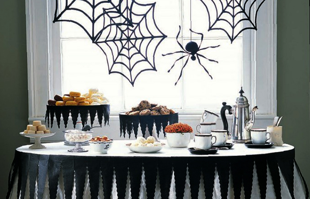 Uma mesa de guloseimas pode ser ainda mais apelativa com a decoração adequada. Basta cobrir a mesa com um lençol ou apenas com uma toalha, branca ou colorida, e decorar com uma grinalda de guardanapos de papel pretos e algumas teias de aranha em cartolina.