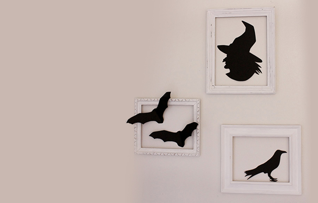 Uma forma original de decorar para o Halloween é criar quadros assombrados. Basta substituir os quadros e molduras que tem em casa, ou cobri-los apenas com papel branco, e colar com fita adesiva algumas silhuetas de cartolina, em forma de bruxas, monstros, morcegos, gatos pretos ou ratinhos.
