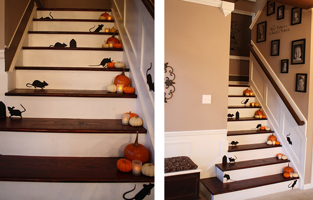 Basta recortar algumas silhuetas em cartolina, em forma de corvos, ratos ou gatos pretos, e organizá-los pela casa para dar um efeito muito divertido. Para enriquecer a decoração basta juntar algumas abóboras ou velas. Pode descarregar algumas silhuetas de ratinhos aqui.