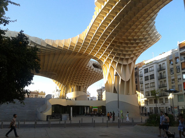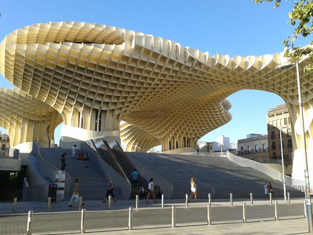 Os seis "cogumelos" amorfos, mais altos que os edifícios adjacentes que parecem flutuar sobre a praça proporcionam sombras em xadrez sobre a praça, tal como na mesa Opera, mas a uma escala inferior. Inspirada nas cúpulas da catedral e nas árvores da Plaza del Cristo de Burgos, a Metropol de Sevilha está alicerçada em seis "troncos", com sapatas em betão armado, onde se encontram os elevadores e escadas que dão acesso aos outros níveis. Também a mesa Opera está alicerçada em bolas de madeira maciça que ajudam a dar estabilidade à estrutura.