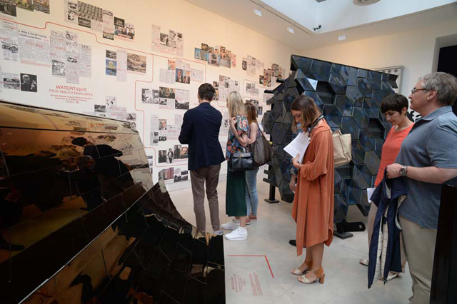 A sala dedicada às fachadas explora diversas possibilidades materiais e formais que este elemento pode assumir, através de configurações geométricas ou orgânicas, numa paleta de cores e texturas variadas.