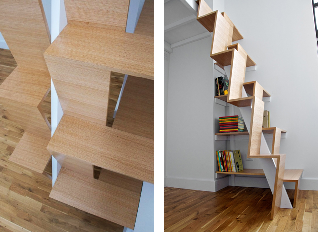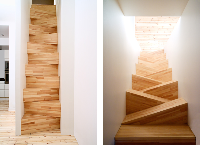#2 Esta escada desenhada pelos suecos TAF é um projecto de baixo orçamento feito a partir de caixas de pinho empilhadas. O recorte entre o piso térreo e o sótão era muito reduzido, não permitindo a construção de uma escada regular, pelo que os degraus tiveram que ser inclinados para obter uma proporção funcional entre a quantidade total e a altura de cada um.