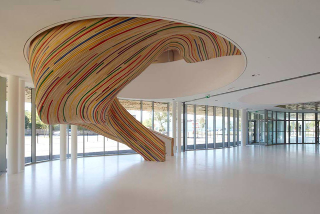 #9 Os franceses TETRARC projectaram esta grande escada verdadeiramente escultórica para uma Escola de Artes, revestida a tiras de madeira laminada, algumas das quais foram pintadas para aumentar o dinamismo que proporciona ao espaço.