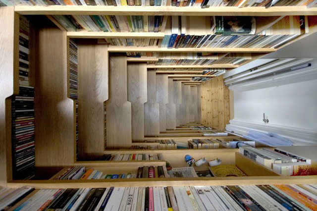 #7 Esta belíssima escada em espiral envolvida com estantes foi projectada pelo arquitecto português Manuel Maia Gomes e extraordinariamente bem fotografada por Fernando Guerra. A escada insere-se na Casa Antero de Quental que reabilita a antiga casa deste poeta do século XIX, transformando-a num centro literário.