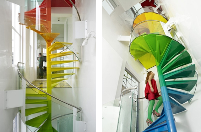#3 Esta colorida escada em espiral, projecto de AB Rogers, foi feita sob medida em estrutura de aço e fibra de vidro colorida, atravessando todo o espectro do arco-íris à medida que sobe pela casa. Em cada andar, a cor difunde-se criando um ritmo visual sobre um eixo vertical.