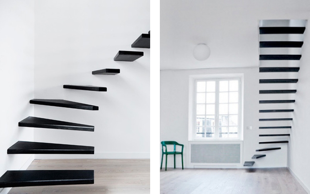 #10 Para os adeptos de soluções minimalistas, esta escada desenhada pelo atelier parisiense École parece levitar, ligando a área social com a área mais privada da casa, assegurando leveza e transparência ao espaço, contrastando com a parede adjacente que a suporta.
