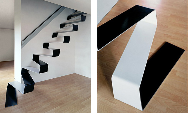 #1 Esta escada concebida pelo atelier HŠH Architects assemelha-se a uma delicada fita que se desenrola até à área social da casa. É feita em chapa metálica bicolor, com apenas 10 mm de espessura, em que os pares de degraus contíguos são ligados através de travessas oblíquas ancoradas à parede lateral.