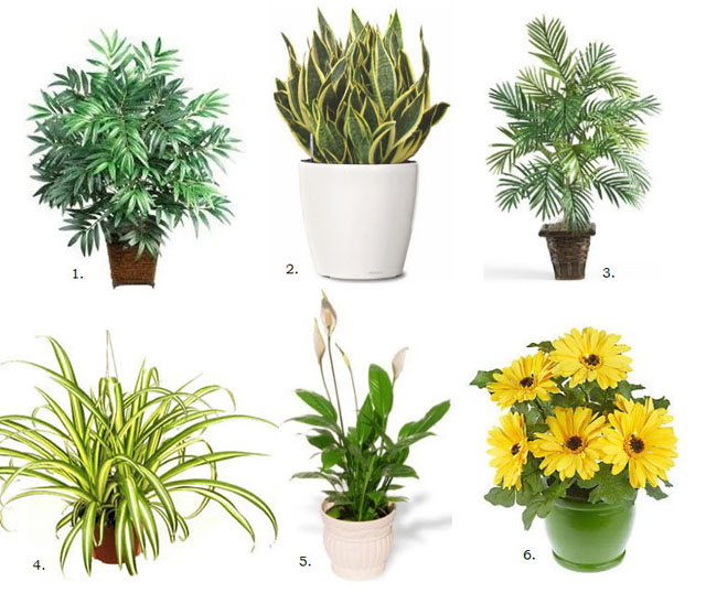1. Palmeira de Bambu | 2. Espada de São Jorge | 3. Palmeira de Jardim | 4. Planta Aranha | 5. Lírio da Paz | 6. Gerbera