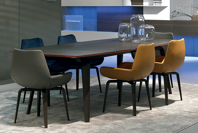 A cadeira Archetto também de Mauro Lipparini apresenta uma estrutura em espuma de poliuretano pulverizada a frio. Estofado em pele ou tecido com base em madeira maciça de carvalho fumé.