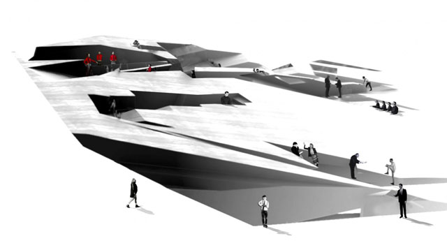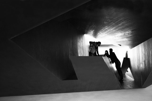 A forma angular da escultura oferece aos seus visitantes a possibilidade encontrar a posição ideal para completar as suas tarefas ao longo do dia.