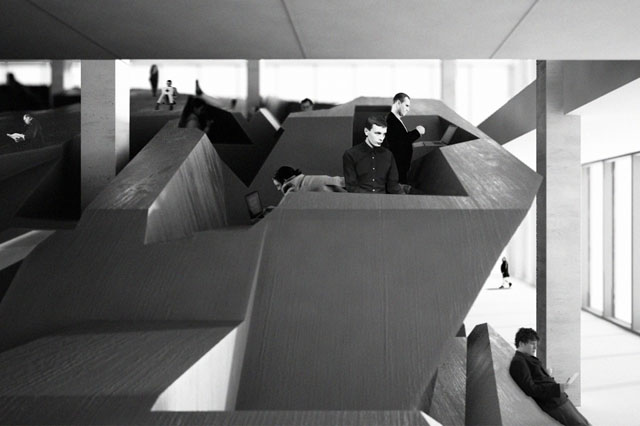 Desenvolvido pelos arquitectos holandeses RAAAF em parceira com a artista plástica Barbara Visser, “Outstanding Landscape of Affordances” (extraordinária paisagem de possibilidades) é um projecto que explora diversas possibilidades para incentivar os escritórios contemporâneos a proporcionarem um estilo de vida mais activo e saudável, oferecendo uma paisagem de possibilidades alternativas de posições para trabalhar.