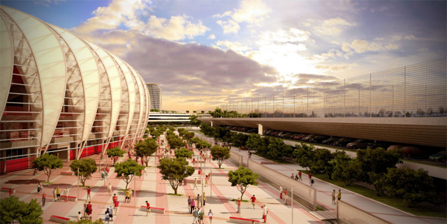 No exterior, existem quase cem mil metros quadrados de espaço para autocarros, 8000 lugares de estacionamento público, 222 lugares de estacionamento VIP e 2850 lugares para a imprensa.