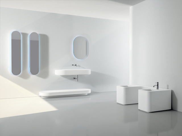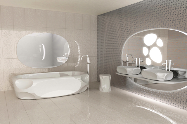 Karim trabalhou com um padrão orgânico 3D e a partir de recortes suaves com arestas nítidas, fez com que a superfície das loiças sanitárias captasse a luz de forma a dar profundidade mas mesmo tempo tornando-as fáceis de limpar.