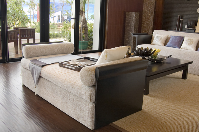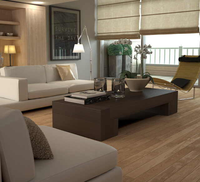 Revestimento do chão: a madeira produz energia árvore e geralmente garante um fluxo harmonioso de energia chi na sala. Um tapete na zona dos sofás convida ao conforto.