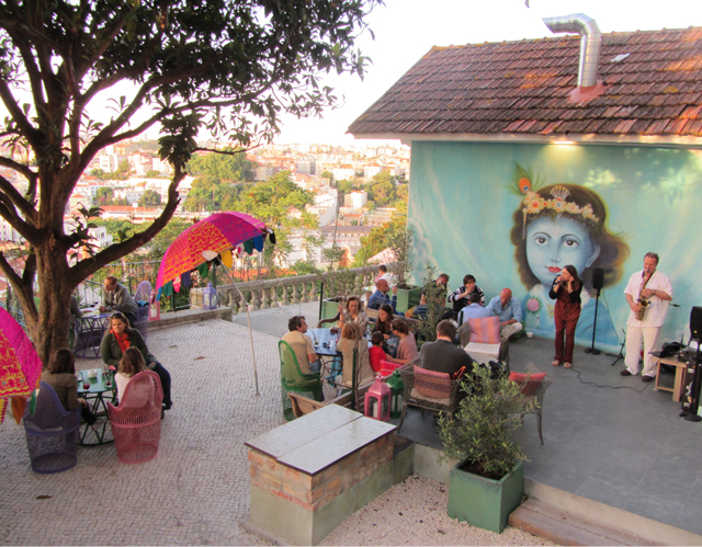 Por entre o jardim e as gentes, por cima do deck de madeira deste terraço de vista incrível é difícil não saborear um copo de vinho e deixar as preocupações espairecer ao som da boa música.