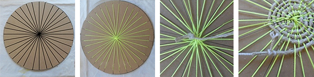 Dê um corte (cerca de 1cm) na extremidade de cada linha e faça passar fios traçando diâmetros ao círculo. Pegue num cordão, prenda-o no centro do círculo e inicie a sua espiral alternando o cordão por cima e por baixo de cada fio, numa espiral bem apertadinha.