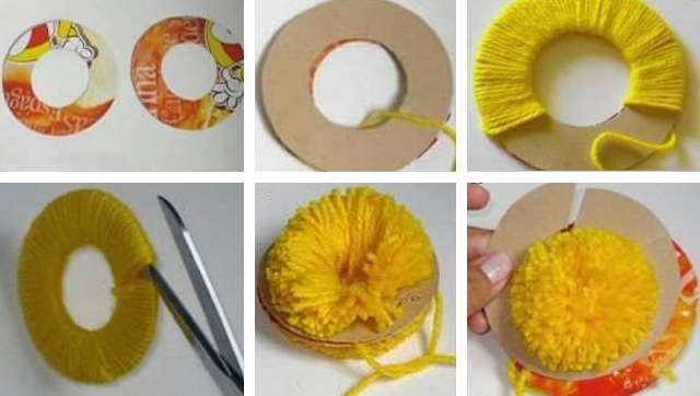 Basta recortar dois círculos em cartão, enrolar a lã, depois cortá-la separando os dois círculos e atar pelo centro. Não se esqueça de deixar as pontas mais longas para poder atar à base que poderá ser em serapilheira.