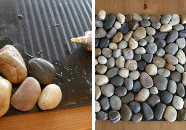 “Pedras no caminho? Um dia vou construir um castelo...” E se com várias pedras construir um tapete? Escolha pedras de tamanhos mais ou menos equivalentes e cole-as a uma base com o formato pretendido. Estes tapetes de pedras resultam muito bem nas portas de entrada e zonas de banho, pois, para além do agradável aspecto estético, também provocam uma boa sensação com pés descalços, activando a circulação sanguínea.