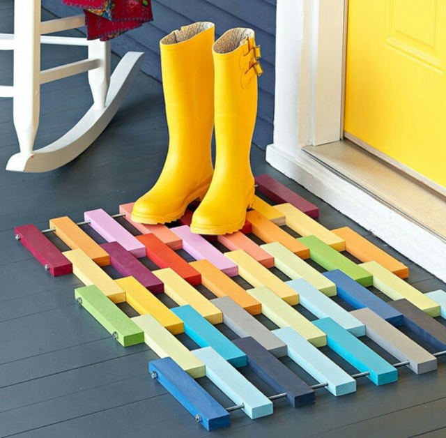 Para reaproveitar materiais, podemos ir ao cesto dos retalhos e escolher tecidos de cores diferentes, cortando-os em tiras que entrelaçadas entre si, formam um tapete original!