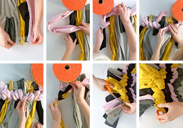 Escolha cinco tiras de tecidos de cores diferentes, corte-as a meio e disponha-as lado a lado, espelhadas ao centro. Prenda as pontas com fita adesiva. Pegue na fita mais à esquerda e dê um nó na fita imediatamente ao lado, repetindo os nós nas fitas seguintes, até ao centro. De seguida, pegue na fita da mesma cor, mais à direita, e siga o mesmo método até ao centro. Faça o mesmo com as restantes fitas e utilizando uma linha remate as pontas no final.