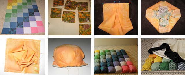 Recorte tantos quadrados quantos os relevos que pretende nos tecidos que goste. Depois recorte o mesmo número de quadrados de menor dimensão noutro tecido qualquer e cosa-os unindo-os pelas pontas, como na imagem. Repita o processo para todos os quadrados e encha-os de espuma para almofada. Alinhe todas as bolas de tecido e cosa-as entre si. Por fim, arranje um tecido que sirva de base ( e que poderá ter um folho) e cosa-o ao tapete de bolas.